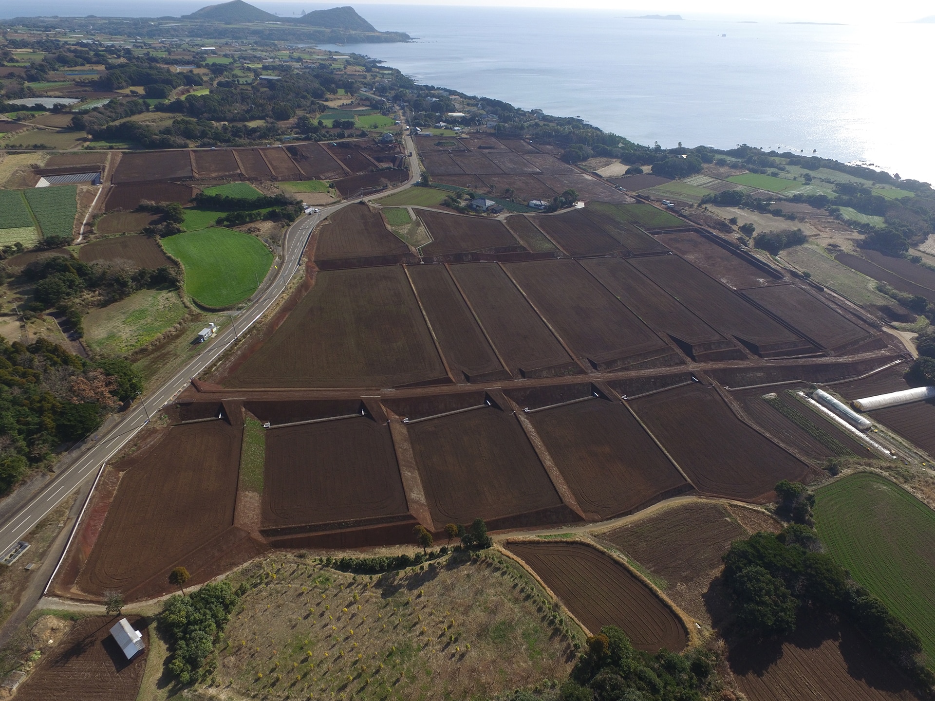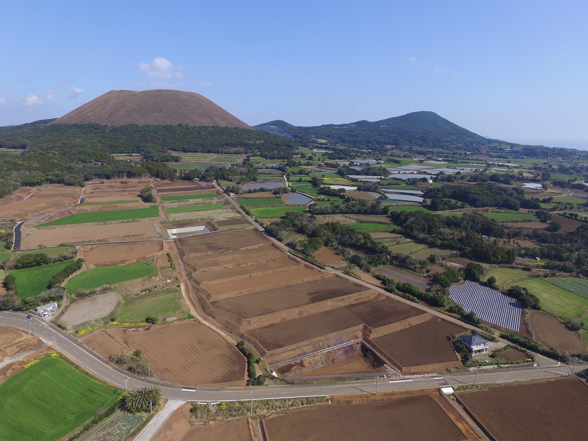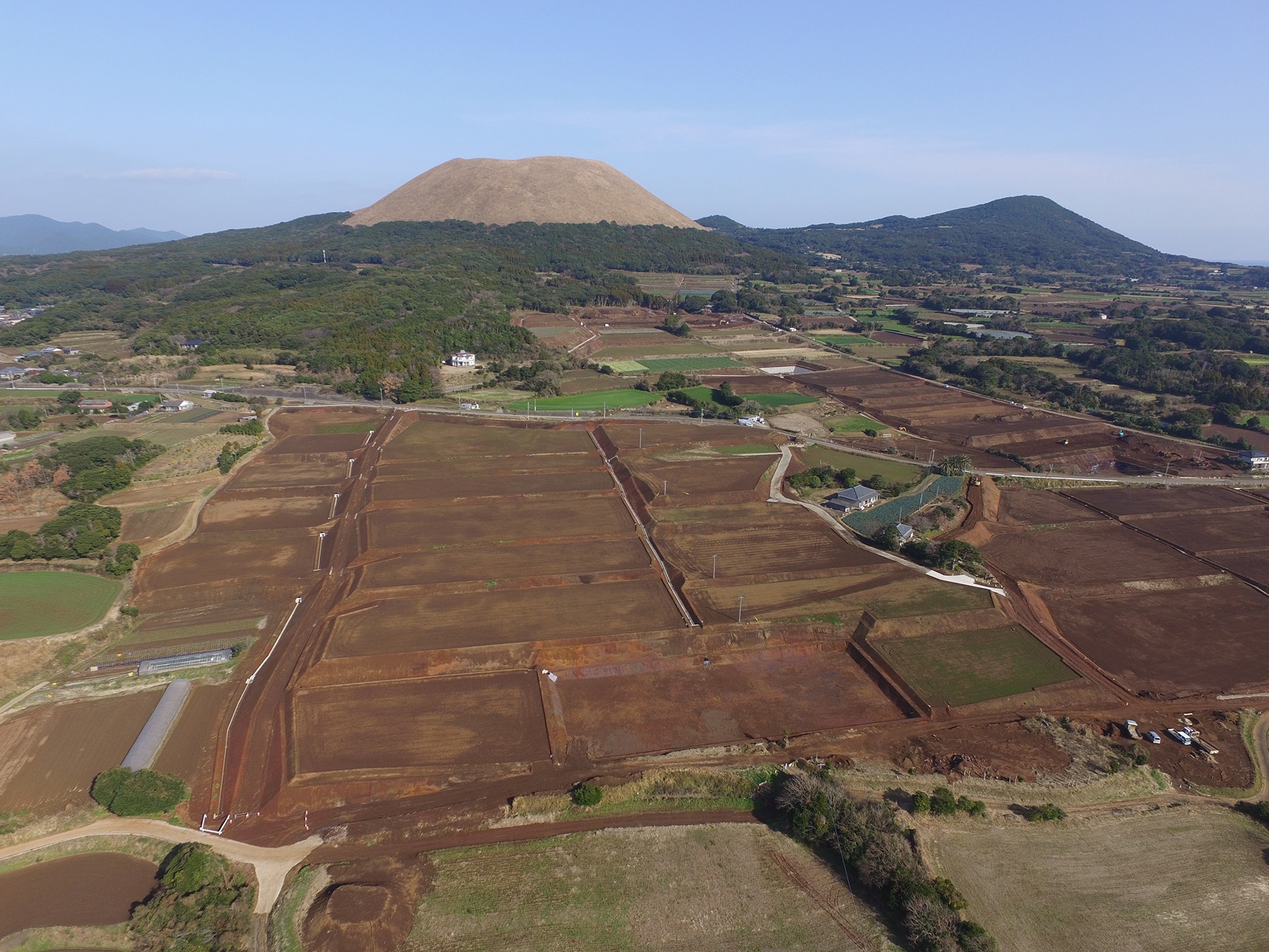 鐙瀬から崎山集落へ続く海沿いの道をしばらくいくと目の前に「箕岳(みたけ)」が現れます。麓付近には桜が満開になる園地があり、春には花見客で賑わい、左手には変わらず鬼岳がある美しい風景。麓に広がる畑の土は火山の噴出物からなるため、色は赤茶色でサラサラしていて、じゃがいもなどの栽培に適している土地です。そのような五島市崎山地区鐙瀬の田畑を整理し、新しく畑を整備する事業。当社では2現場に携わっています。
