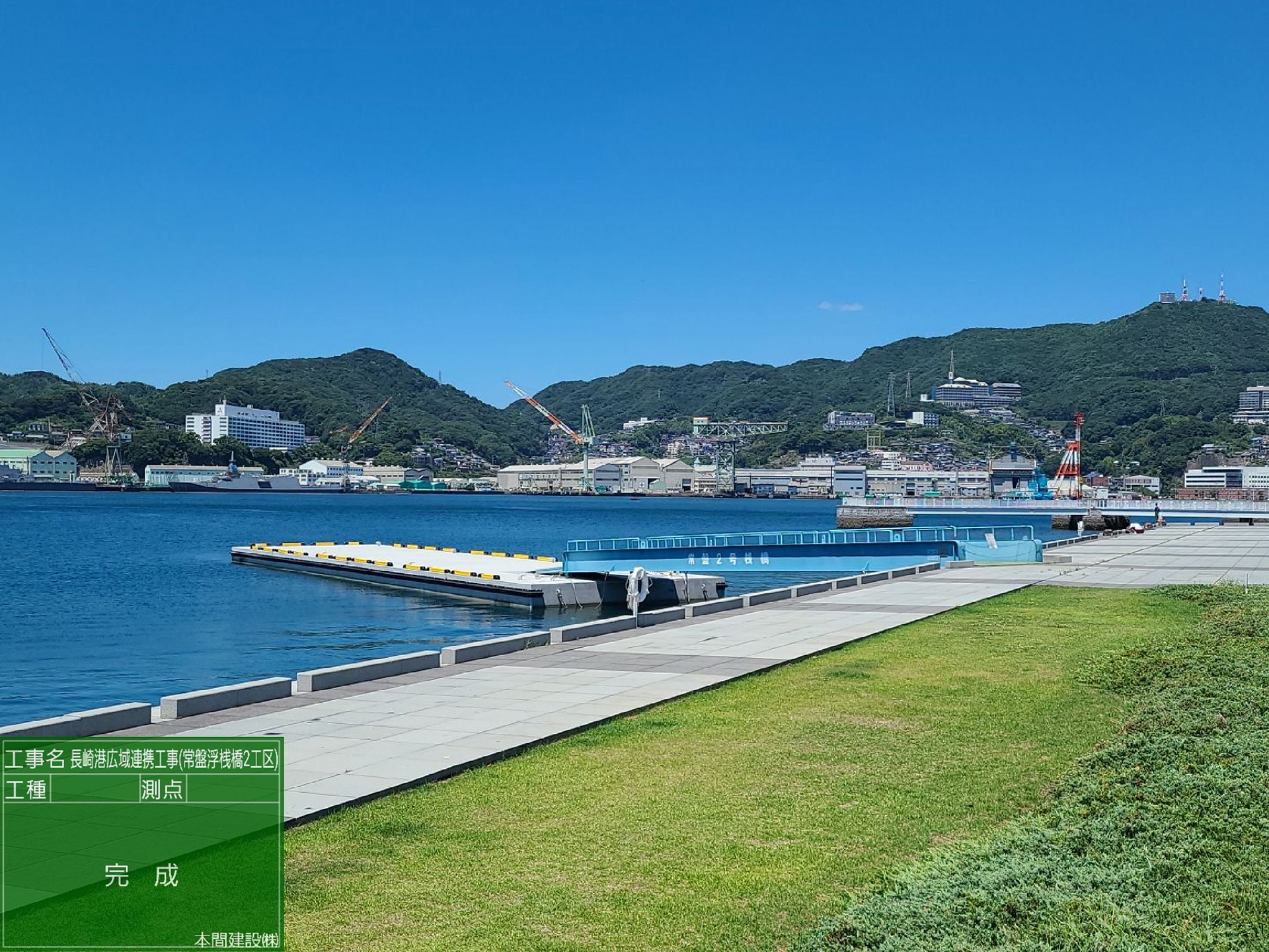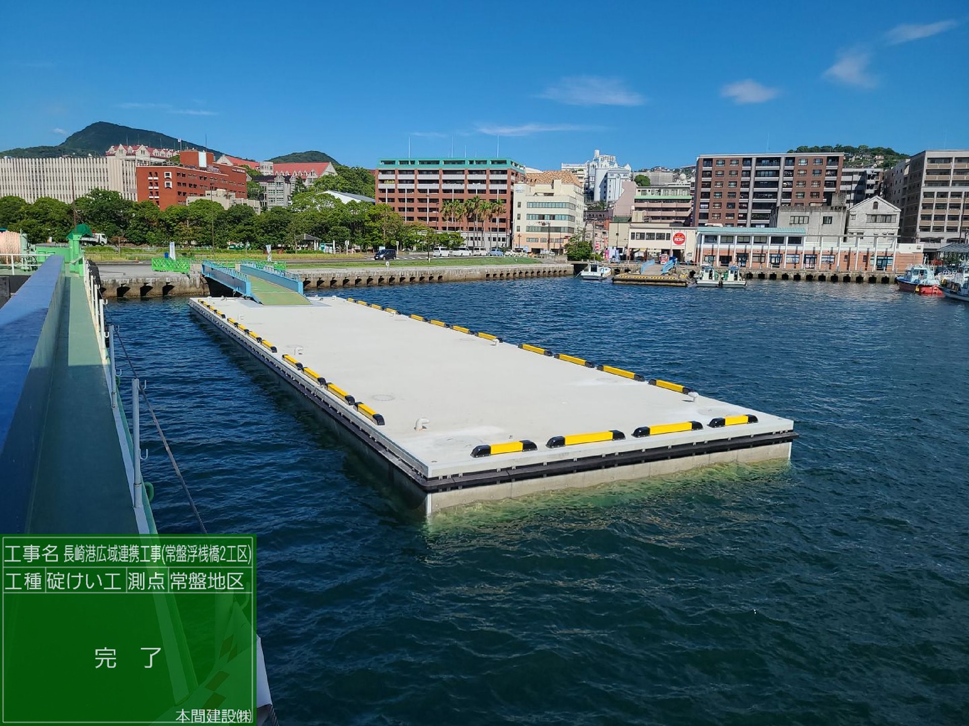 この工事は長崎県内で行き交う船舶の数が最も多い長崎港内での航路上の浮桟橋改良工事となり難易度が高いものでした。また離島航路やクルーズ船など多種多様な船舶が航行する場所での作業になるだけでなく、取り換える浮桟橋はクルーズ船が係留する桟橋で、工事による既存浮桟橋の改良中はその桟橋が使用不可能となるため、長崎港内関係者からは工期短縮を強く求められ、制限の大きな工事でした。作業時間帯の工夫や工期短縮の工夫を積み重ねることで、工程を15日短縮する結果となりました。