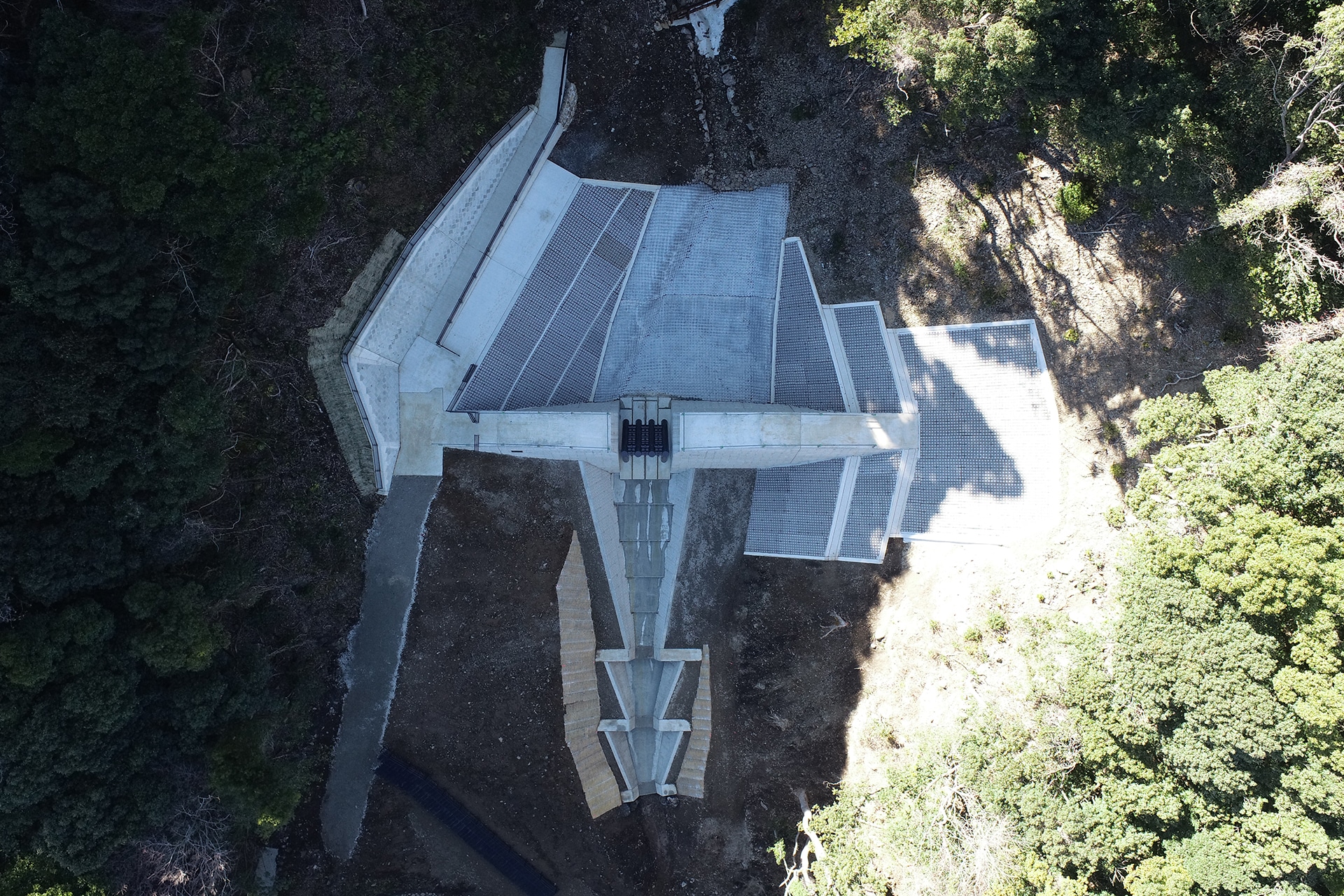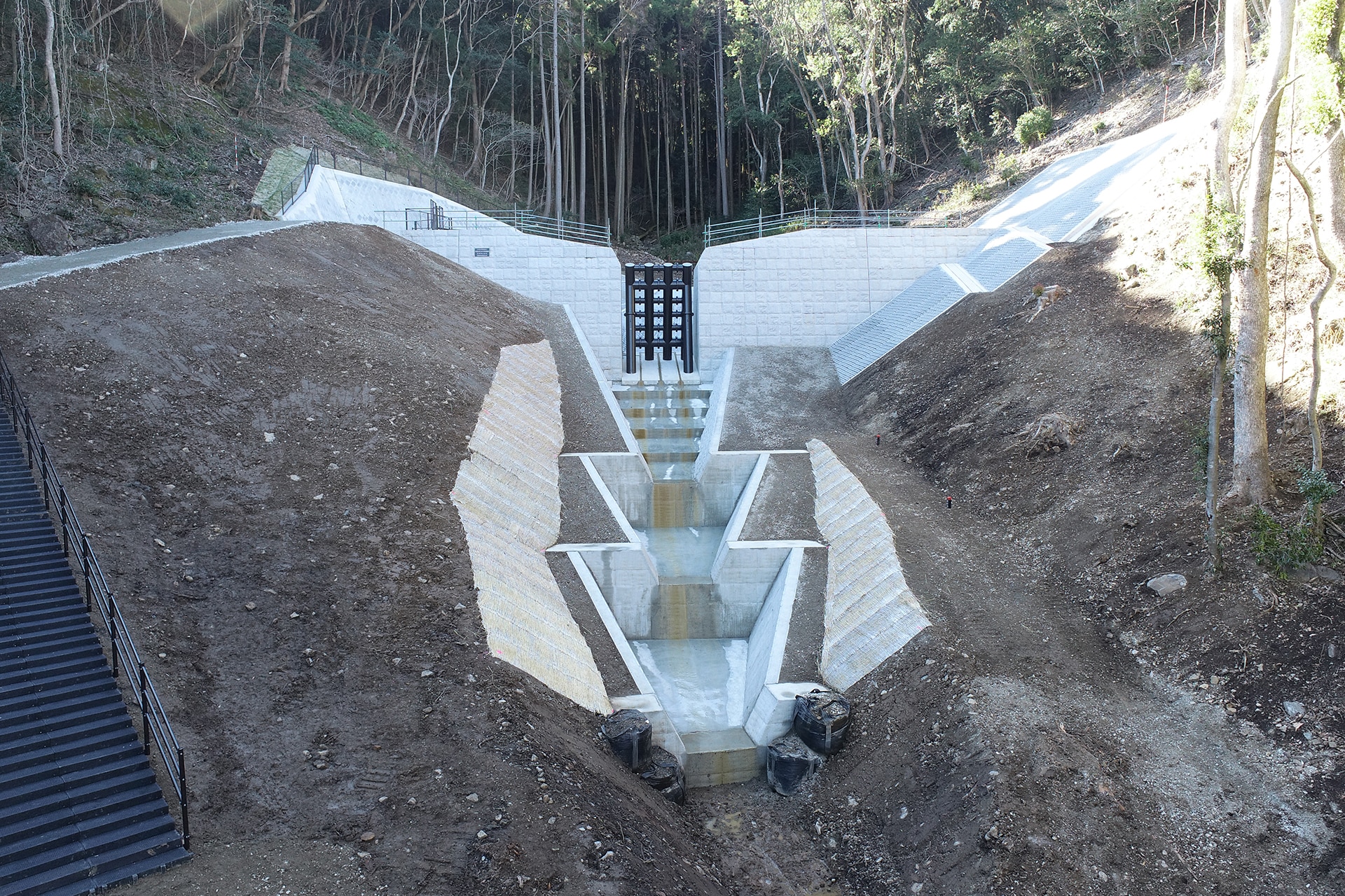 稲佐山の東側斜面に位置する紅葉谷川は、標高280mにその源があり、2級河川の浦上川に合流しています。紅葉谷川は流域面積0.1㎢と大きく、渓流勾配が1/5.7と急で土石流の発生の恐れが高いため、渓流谷出口に砂防堰堤を設置する必要がありました。工事期間中は安全対策に取り組むだけでなく、地域住民とのコミュニケーションもとりながら工事をすすめました。現場見学のイベントには多くの地域住民が参加。公共工事への理解を得ながら工事をすすめることができました。